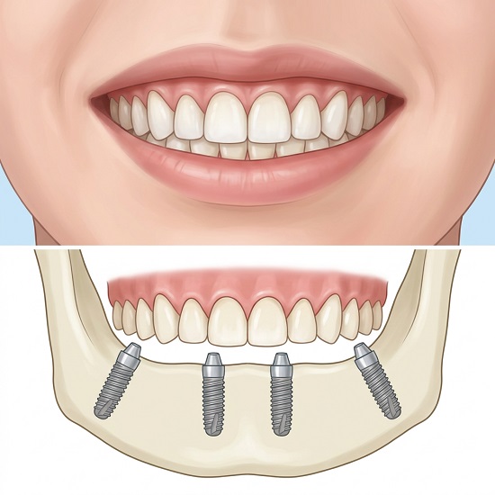 Instead of placing an implant for every missing tooth, dentists position four titanium implants into the jawbone. Those implants act as anchors for a full set of teeth.